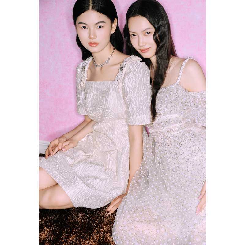 OBBLIGATO奥丽嘉朵2023秋季米色方领设计肩头点缀蝴蝶结肌理感连衣裙1C63305610