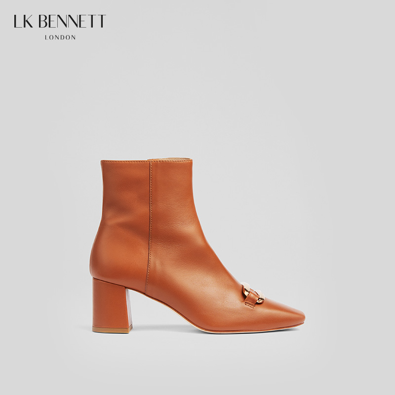 LK BENNETT|2023真皮羊皮革粗跟焦糖色高跟短靴女春秋单靴