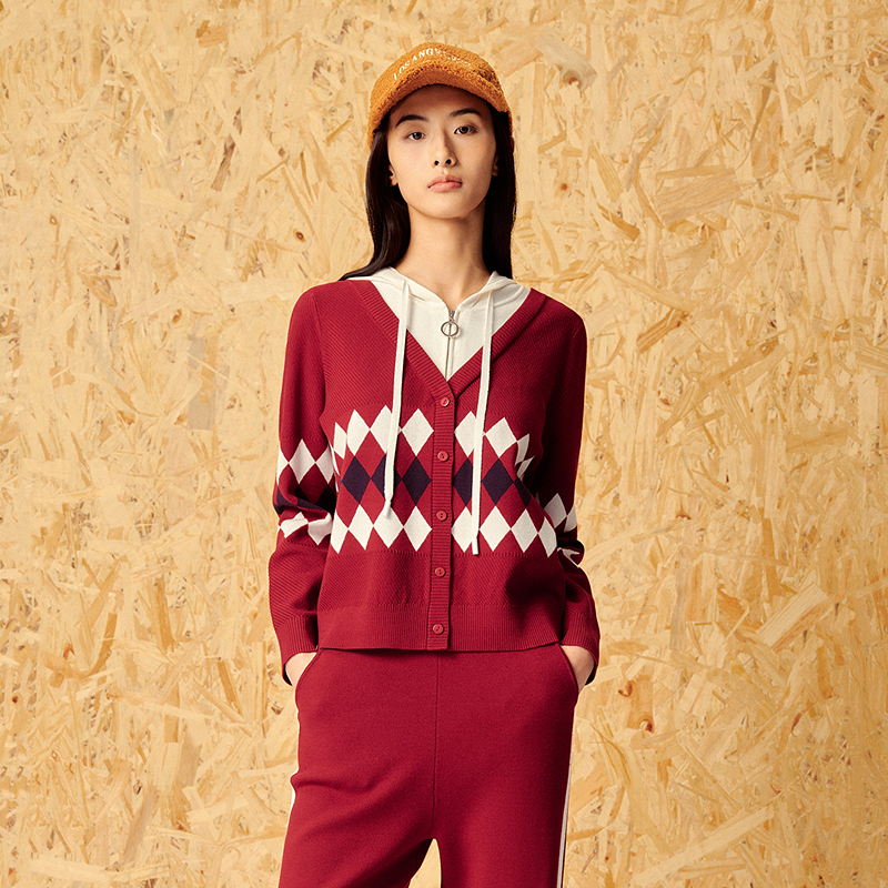 ToyzY24春菱格提花假两件酒红针织外套7C54106510