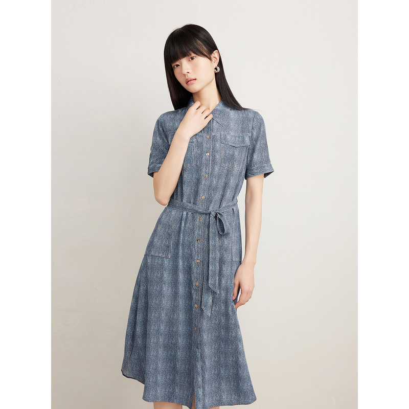 [真丝系列]Goodland美地女装2024夏季桑蚕丝牛仔色衬衫连衣裙LC64205020