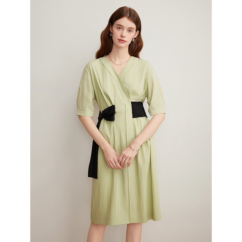 Goodland美地女装 2025夏季黑色蝴蝶结腰封V领连衣裙LC35205350