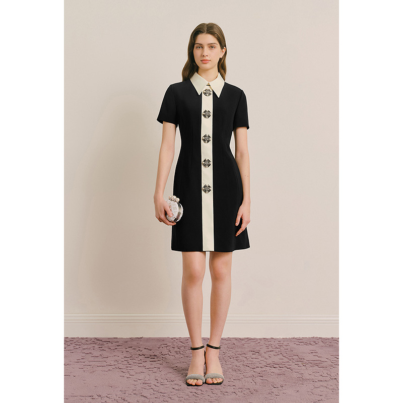 OBBLIGATO奥丽嘉朵专选2025夏季新品尖领撞色绣花扣收腰连衣裙1C65205450