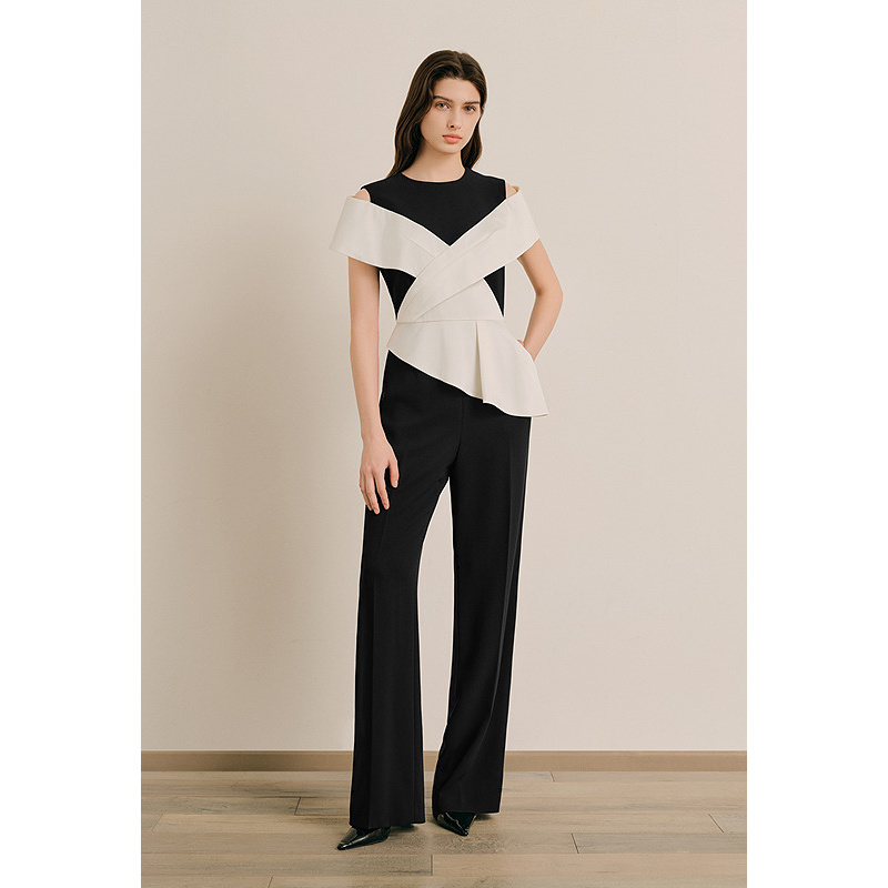 OBBLIGATO奥丽嘉朵专选2025夏季新品黑色圆领撞色拼接荷叶边连体服1C65202060
