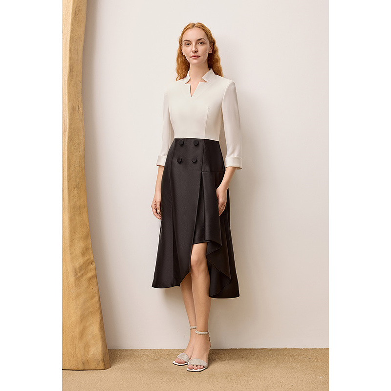 OBBLIGATO奥丽嘉朵专选2025秋季新品撞色黑白拼接捏褶收腰连衣裙1C65305740