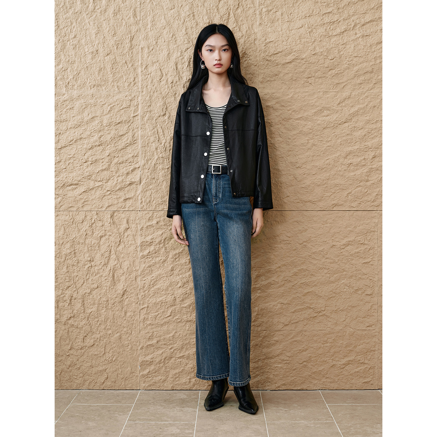 INSUN恩裳专选2025秋季抽绳立领短款羊皮夹克皮衣9C65309080