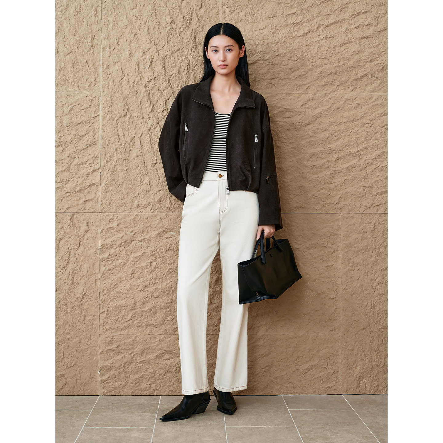INSUN恩裳专选2025秋季布纹绒面落肩羊皮短外套9C65309140