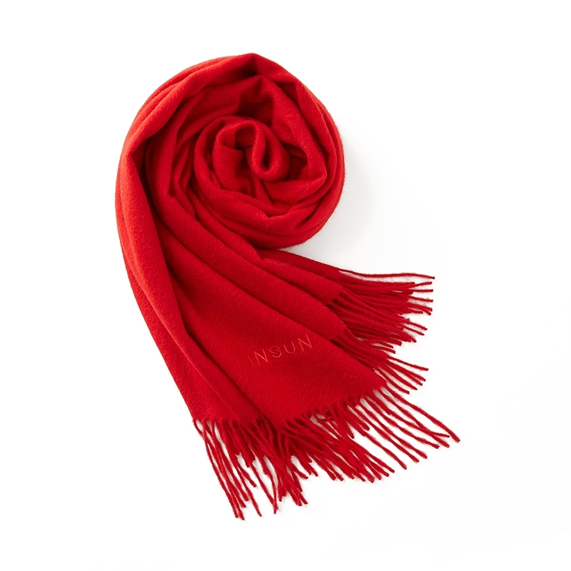 INSUN恩裳2025冬季纯色红色羊羔绒流苏围巾9C35590040