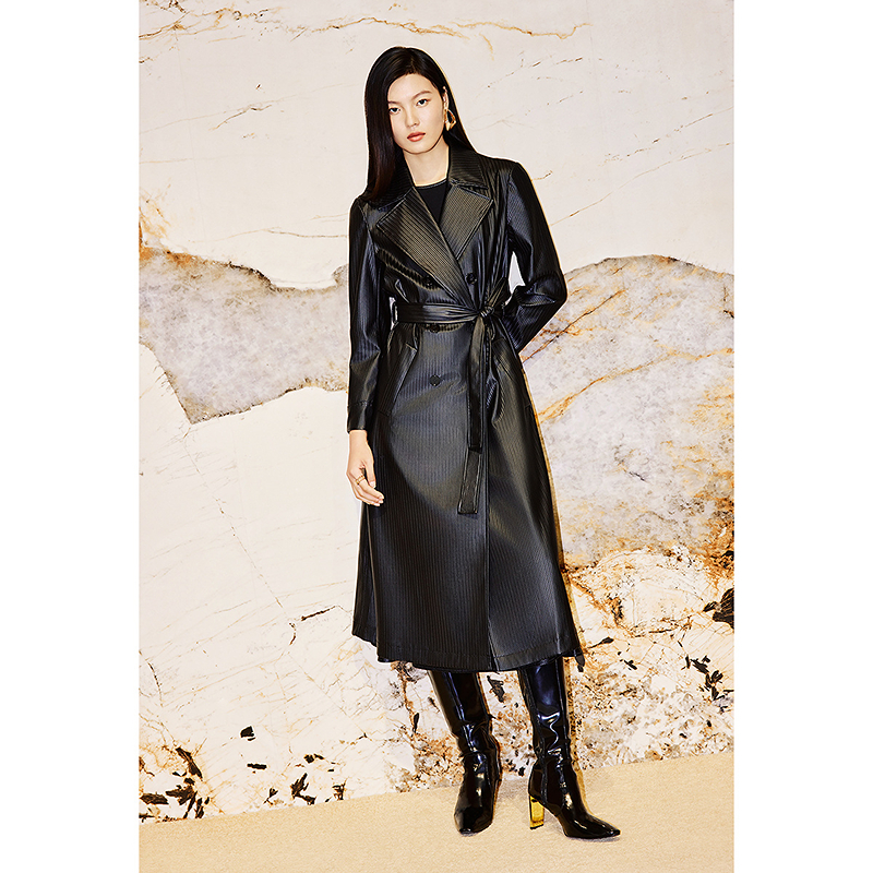 OBBLIGATO奥丽嘉朵2025冬季新品可水洗仿皮质感弹力翻领风衣外套1C35507040