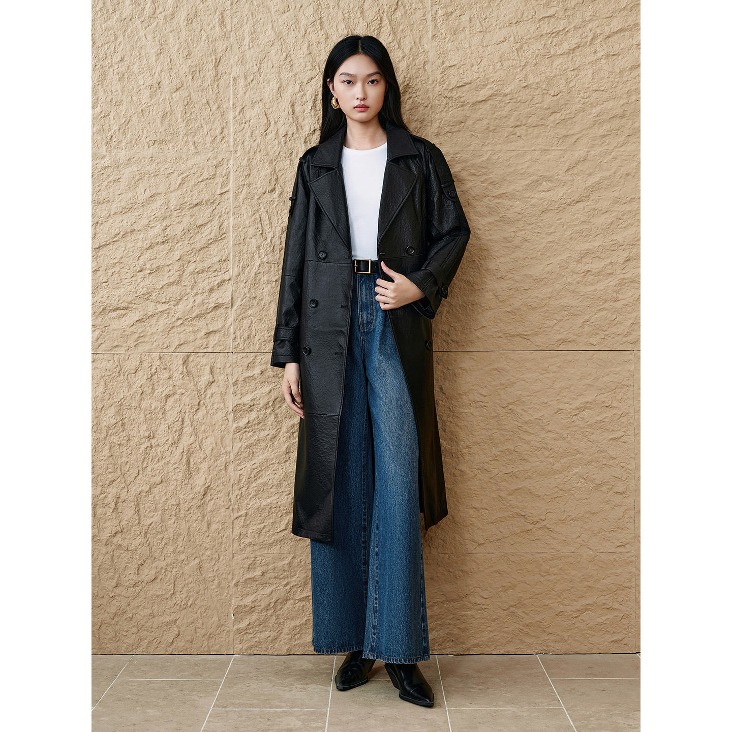 INSUN恩裳专选2025秋季石头纹双排扣宽松羊皮风衣皮衣9C65309150