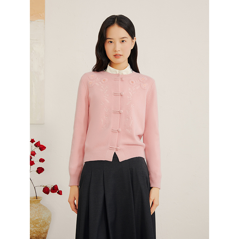YINER音儿专选2025冬季新款惠什粉新中式立体刺绣羊毛套头开衫