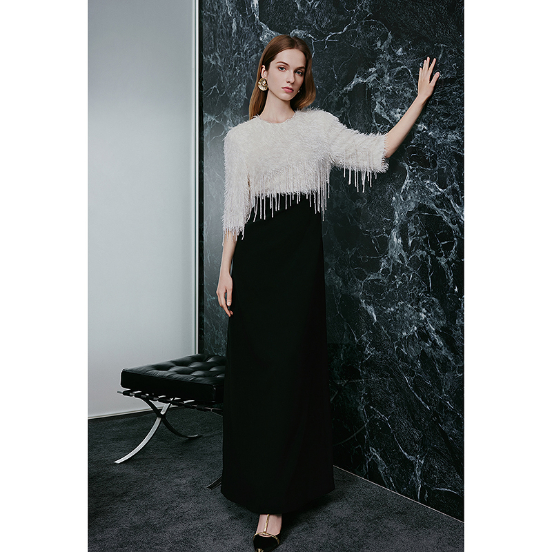 OBBLIGATO奥丽嘉朵专选2025冬季新款手工珍珠流苏拼接礼服连衣裙1C35505545