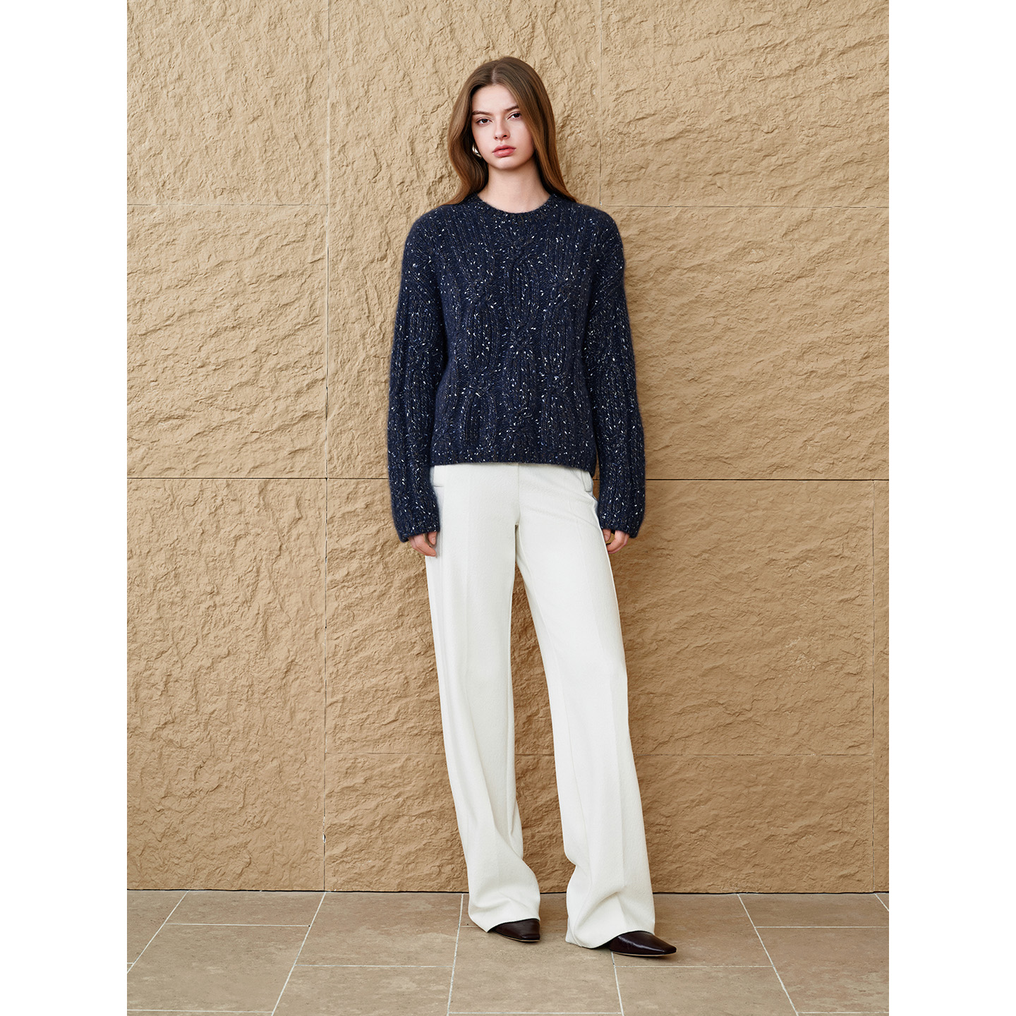 INSUN恩裳专选2025冬季圆领套头绞花短款落肩花纱毛针织衫9C65506270