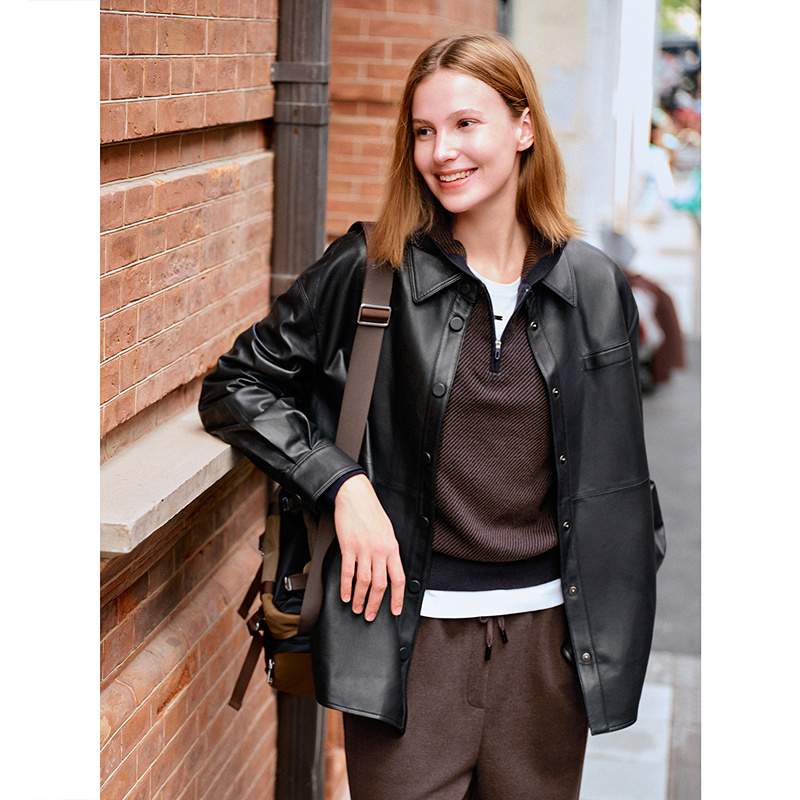 XII BASKET十二篮商场25冬新款经典廓形率性翻领衬衫式皮衣7C35509160