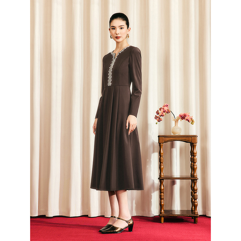 【1996系列】YINER音儿2025冬季新款手工钉珠羊毛混纺小V领连衣裙