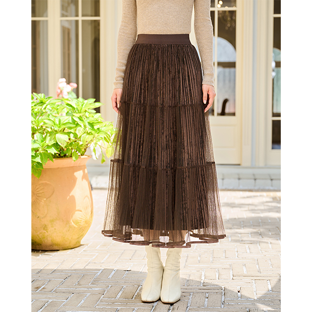 Lumsonare琅颂2025冬季丝绒网纱拼接压褶A字半身裙 9CY5550140