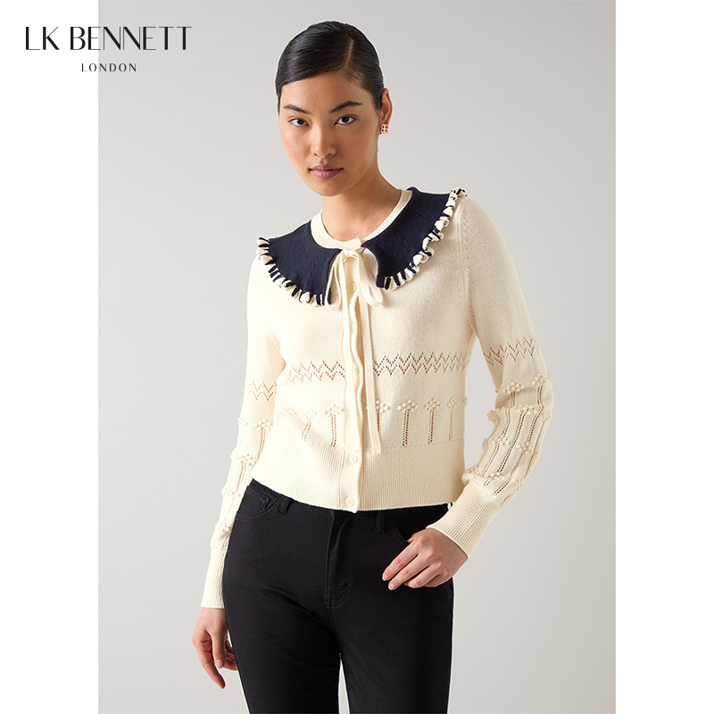 LK BENNETT|2025年新款荷叶花边领镂空绵羊毛针织开衫LKBTIA74015