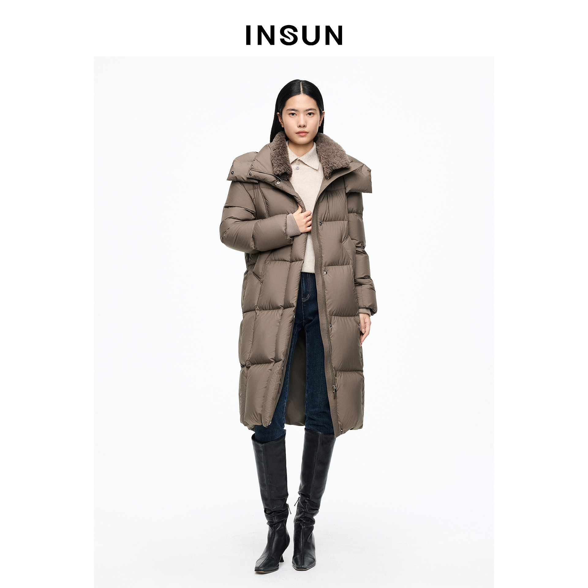 INSUN恩裳专选2026春季可脱卸帽子宽松型中长款羽绒服9C66108510