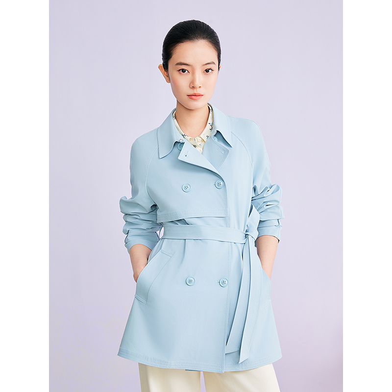 YINER音儿2026春季新款时尚优雅翻领双排扣中长款四面弹风衣外套8C36107070