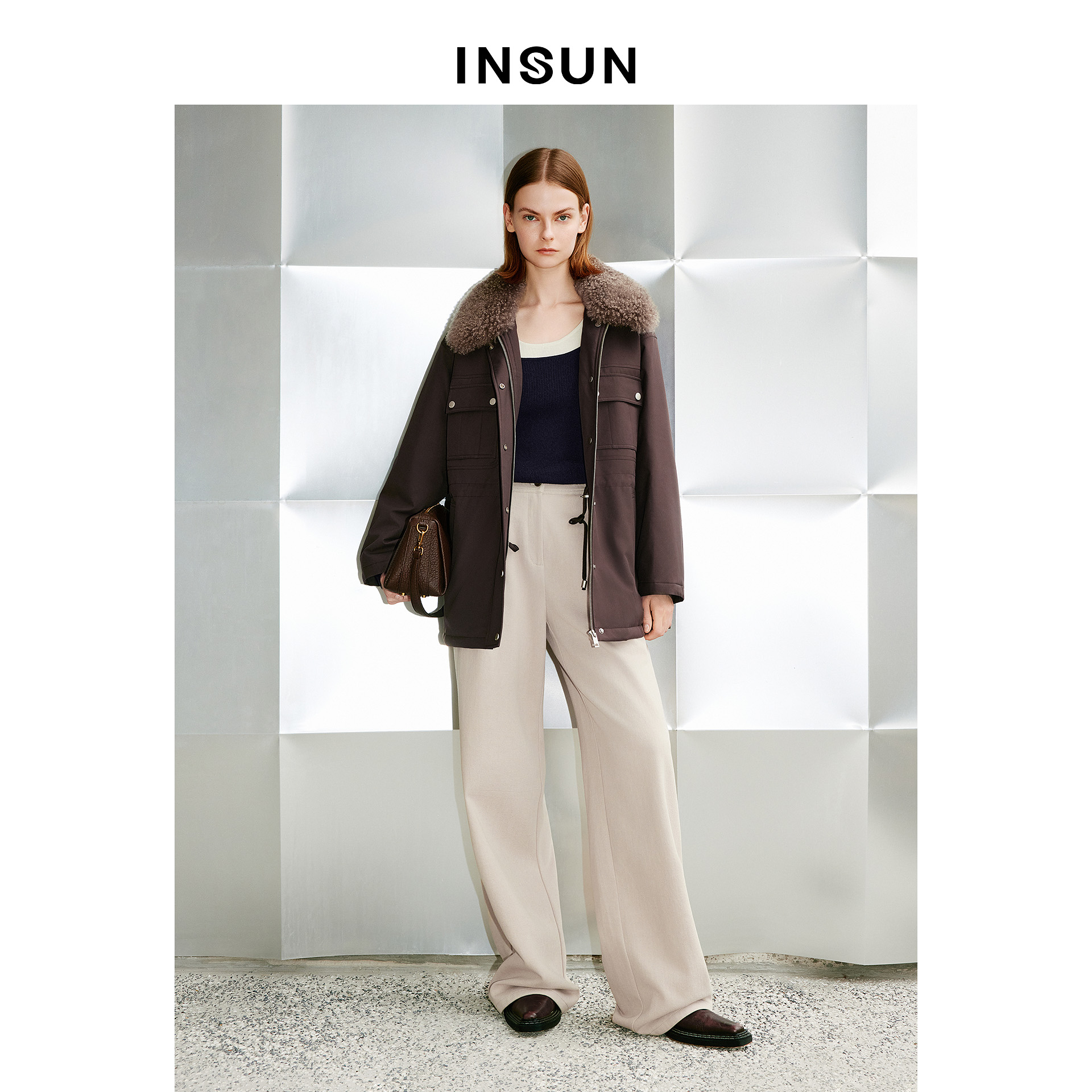 INSUN恩裳专选2026春季可拆卸羊毛革毛领鹅绒派克羽绒服9C66108530
