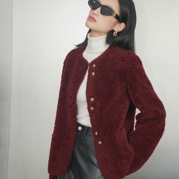COVERINS2025冬季颗粒绵羊毛酒红小香风外套CC35510270