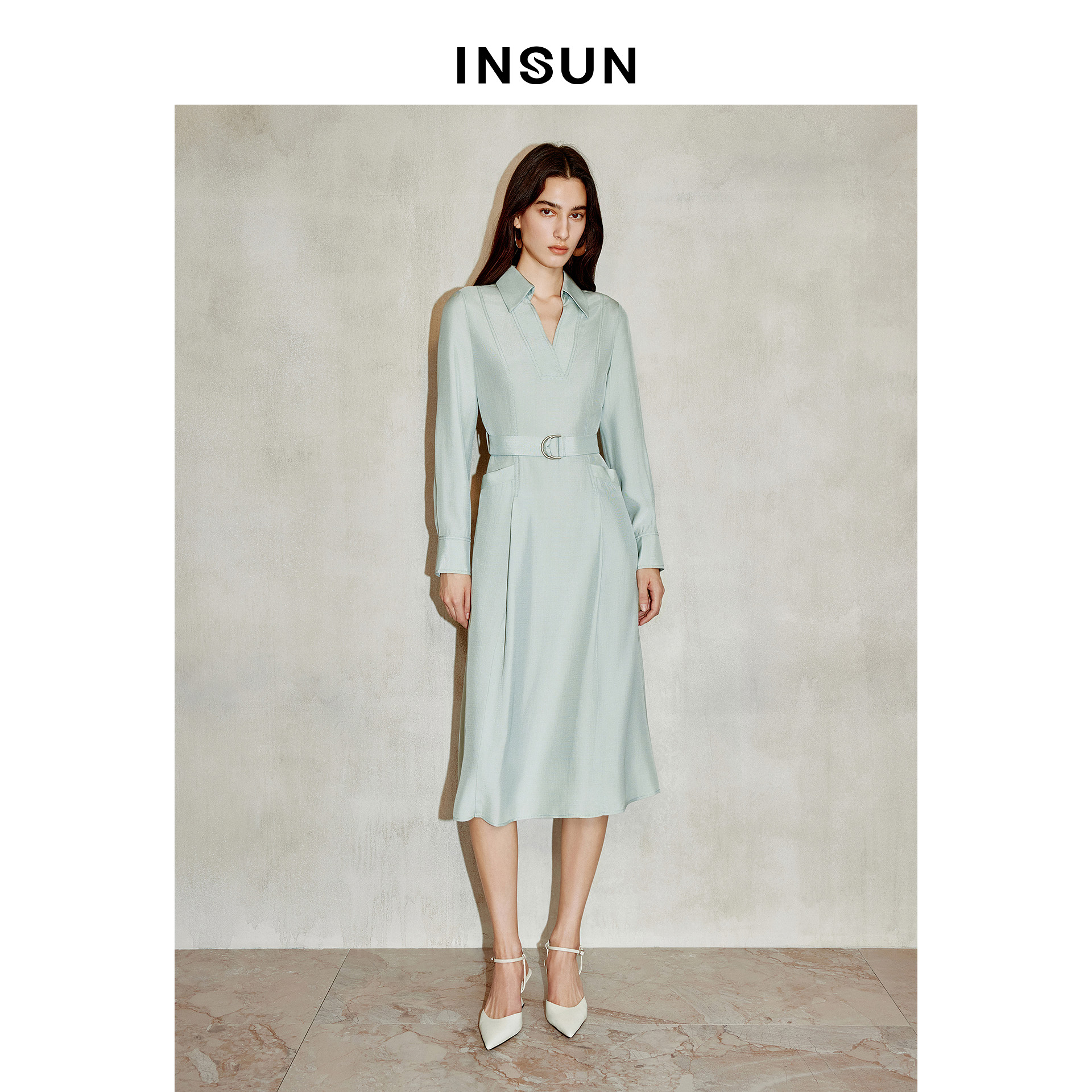 INSUN恩裳专选2026春季衬衫式V领醋酸长袖连衣裙9C66105050