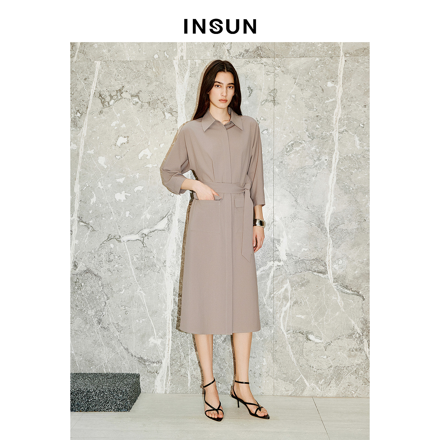 INSUN恩裳专选2026春季斜纹衬衫式廓形醋酸长款连衣裙9C66105010