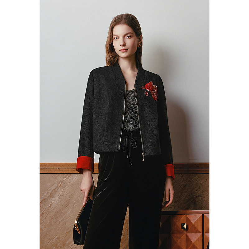 OBBLIGATO奥丽嘉朵2026春季新款绵羊毛混红袖撞色纺珠片刺绣外套1C36110200