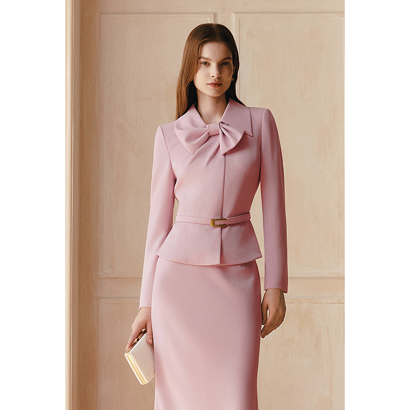 OBBLIGATO奥丽嘉朵2026春季新款醋酸混纺浅粉色蝴蝶结领收腰西装上衣1C66170060