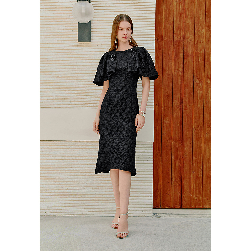 OBBLIGATO奥丽嘉朵2026夏季新款黑色提花肌理手工花朵钉珠连衣裙1C36205160
