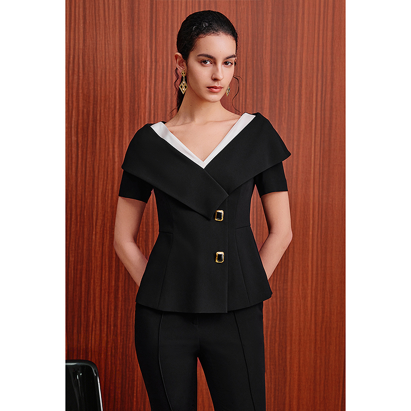 OBBLIGATO奥丽嘉朵2026夏季新款三醋酸黑白撞色光泽感v领收腰上衣1C36270100