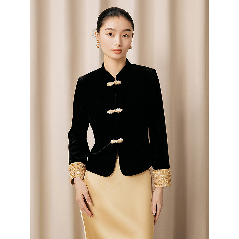 【东方雅韵】Song of Song歌中歌2026春新款黑金丝绒拼接盘扣外套5C36110510