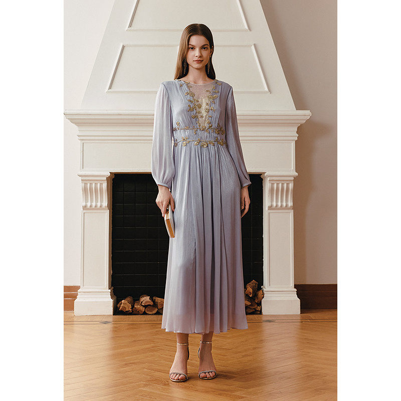 OBBLIGATO奥丽嘉朵2026夏季新款烟灰紫法式立体绣花连衣裙1C36205410