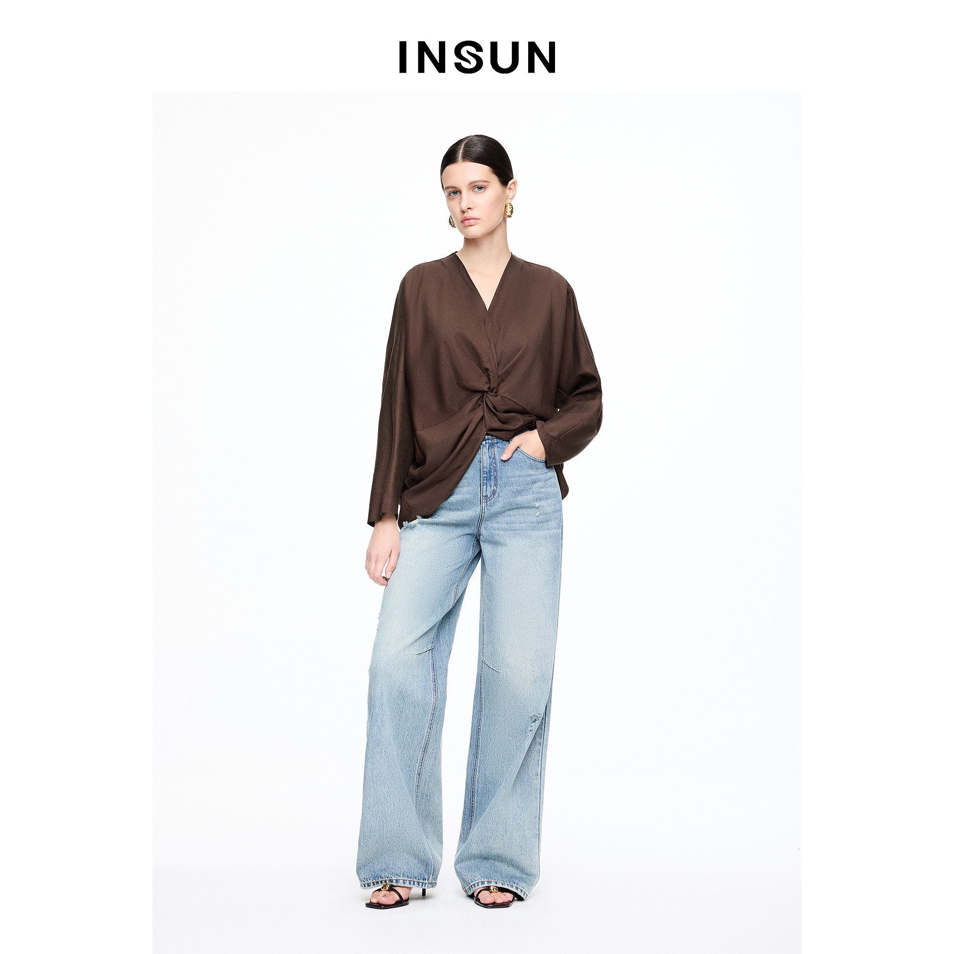 INSUN恩裳专选2026春季老钱风V领气质亚麻长袖衬衫9C66170070