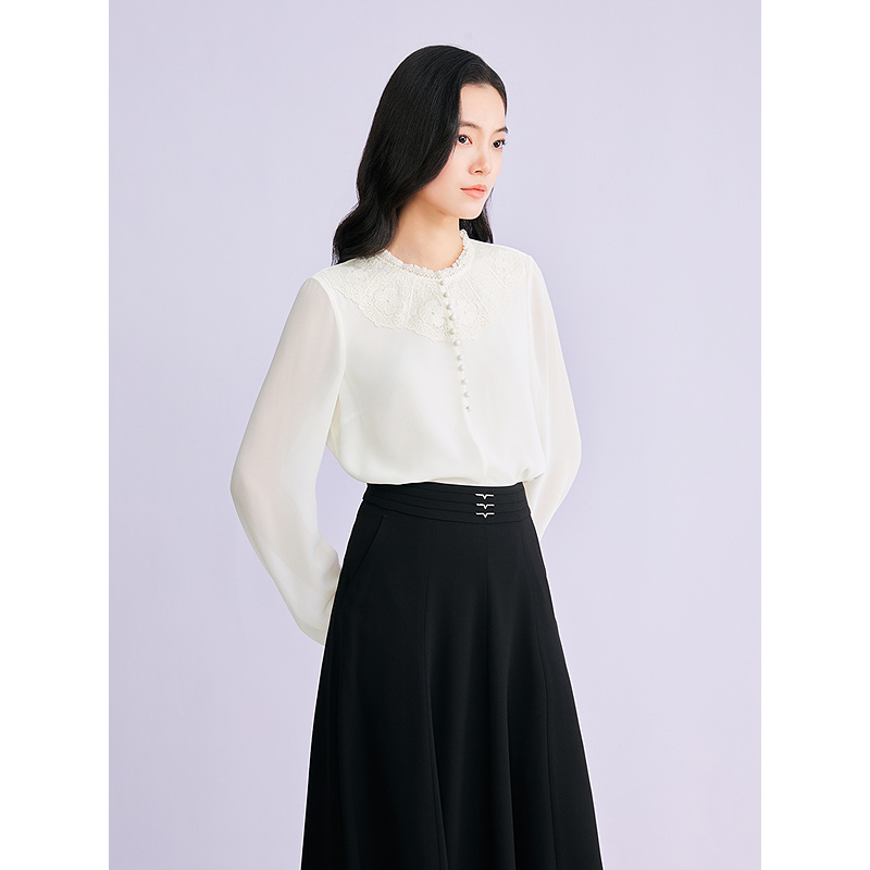 YINER音儿专选2026春季新款时尚通勤OL优雅拼接花边立领衬衫上衣8C66170016