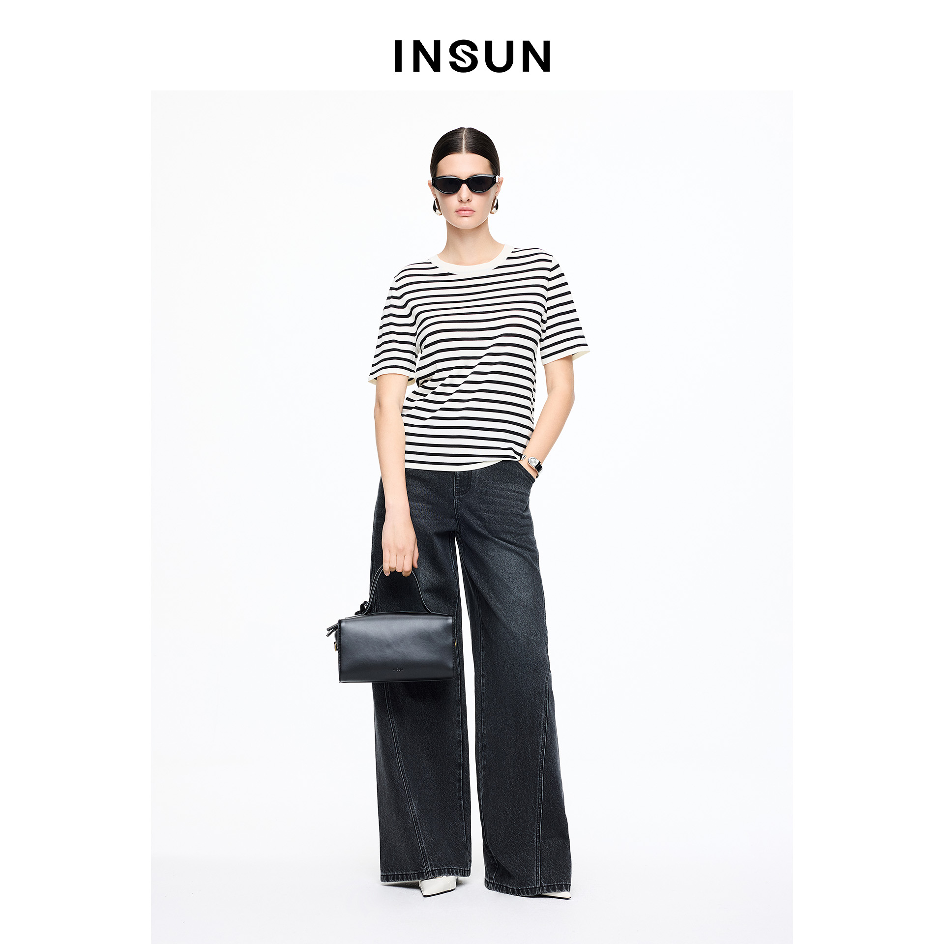 INSUN恩裳专选2026夏季落肩袖型百搭条纹短袖T恤9C66206040