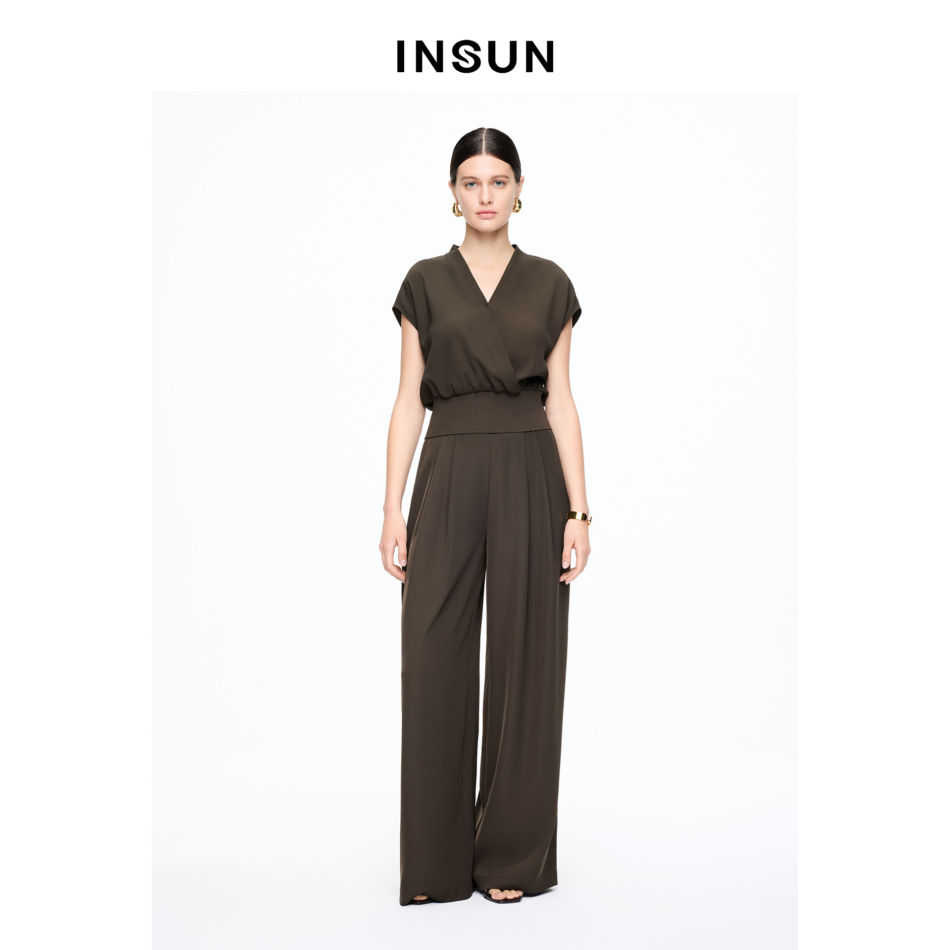 INSUN恩裳专选2026夏季交叉V领落肩袖显瘦T恤9C66270030