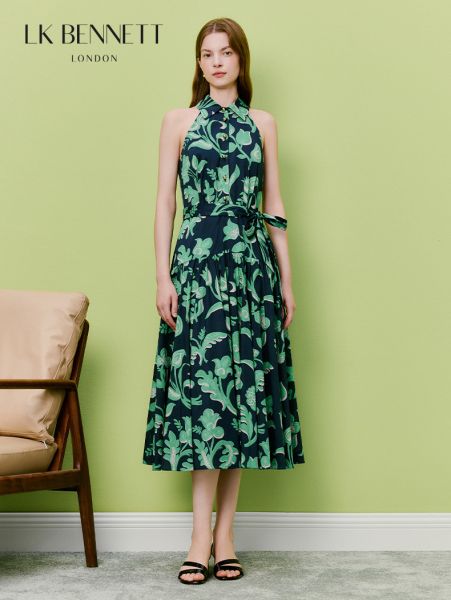 2026新款墨绿撞色藤蔓印花挂脖长裙LKBTSS51060