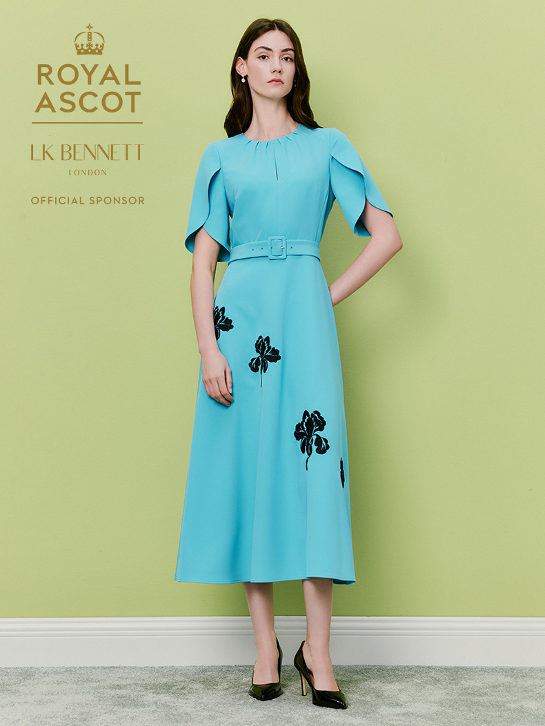 2026皇家赛马会新款蓝色圆领花瓣袖收腰连衣裙LKBTSS51035