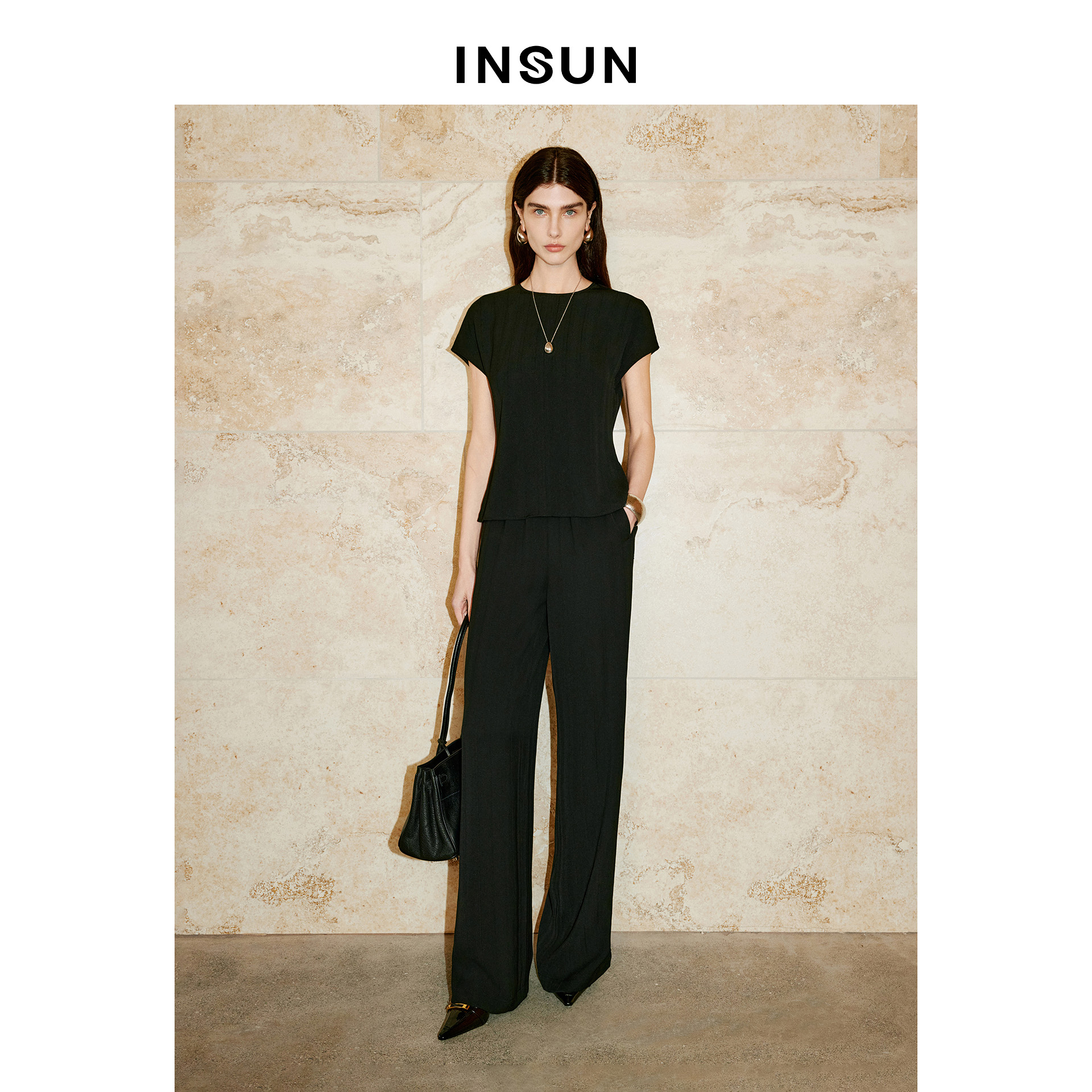 INSUN恩裳专选2026夏季圆领简约竖条肌理感短袖T恤9C66270010