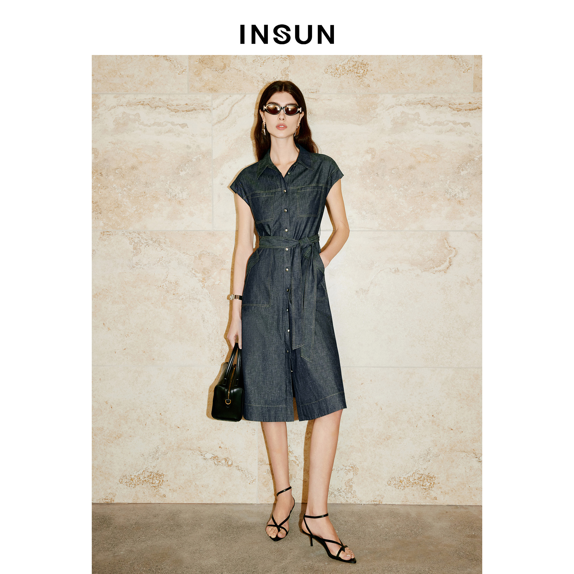 INSUN恩裳专选2026夏季复古风无袖包肩设计桑蚕丝汉麻连衣裙9C66205040