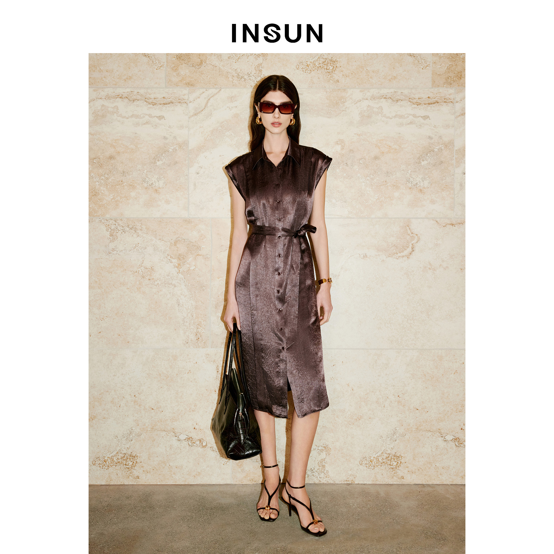 INSUN恩裳专选2026夏季衬衫领修身显瘦无袖醋酸连衣裙9C66205030