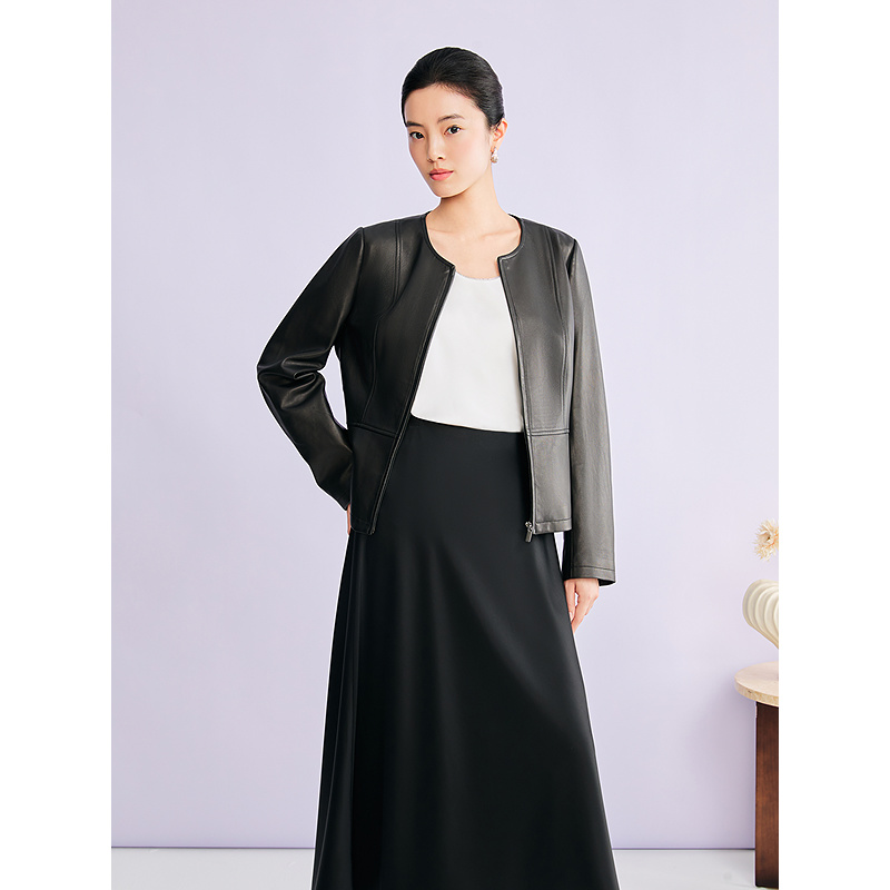 YINER音儿专选2026春季新款时尚圆领羊皮革真皮皮衣短款夹克外套8C66109176