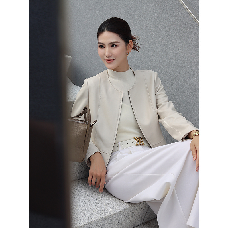 YINER音儿专选2026春季新款时尚圆领羊皮革真皮皮衣短款夹克外套8C66109176