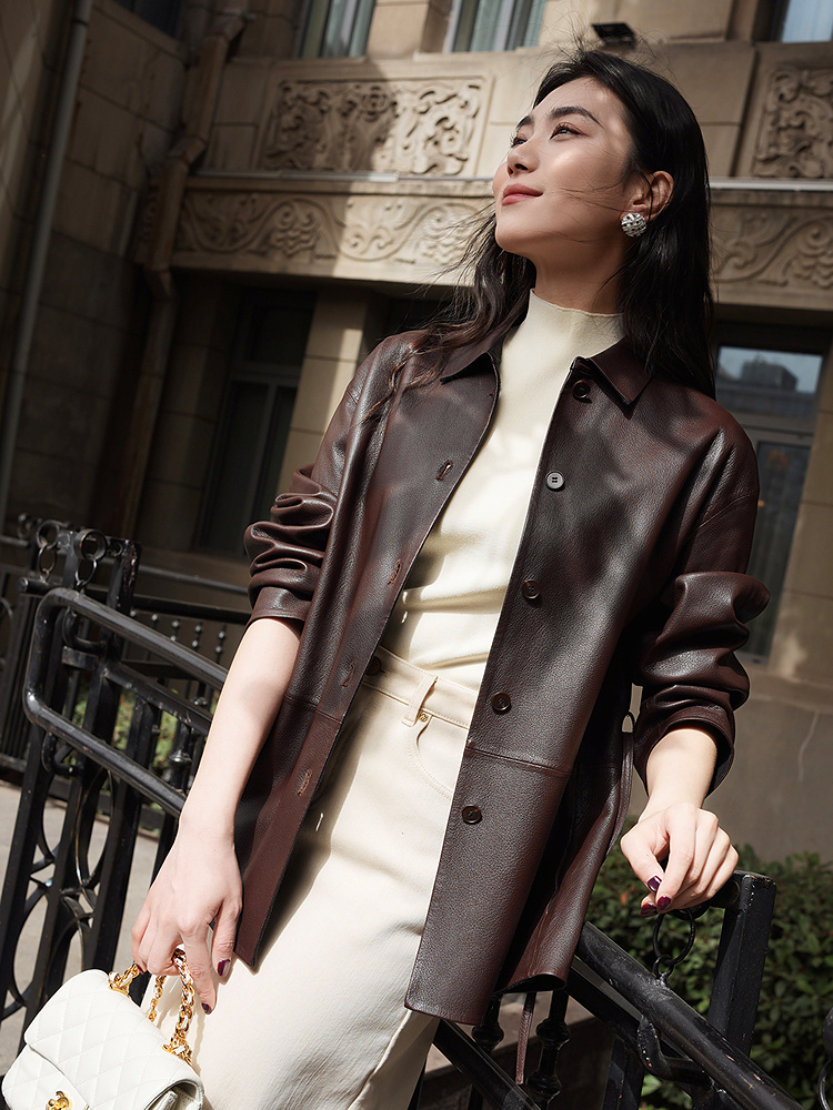 YINER音儿专选2026秋季新款时尚翻领系带羊皮革真皮皮衣夹克外套8C66309206